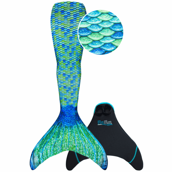 Op zoek naar een veilige zeemeerminstaart, die als gegoten zit en lang meegaat? Kies dan voor de Aussie Green set van Fin Fun. Perfect voor intensief gebruik tijdens zeemeermin zwemlessen, vakanties en bezoekjes aan het zwembad. De kleurencombinatie met glimmende laag zorgt ervoor dat je schittert als een échte blauw groene zeemeermin! Fin Fun staat wereldwijd bekend als hét premium merk voor zeemeerminstaarten. Deze staart uit de Mermaidens collectie is gemaakt van stevige schuurbestendige stof, met verstevigde staartpunten, wat zorgt voor een lange levensduur.